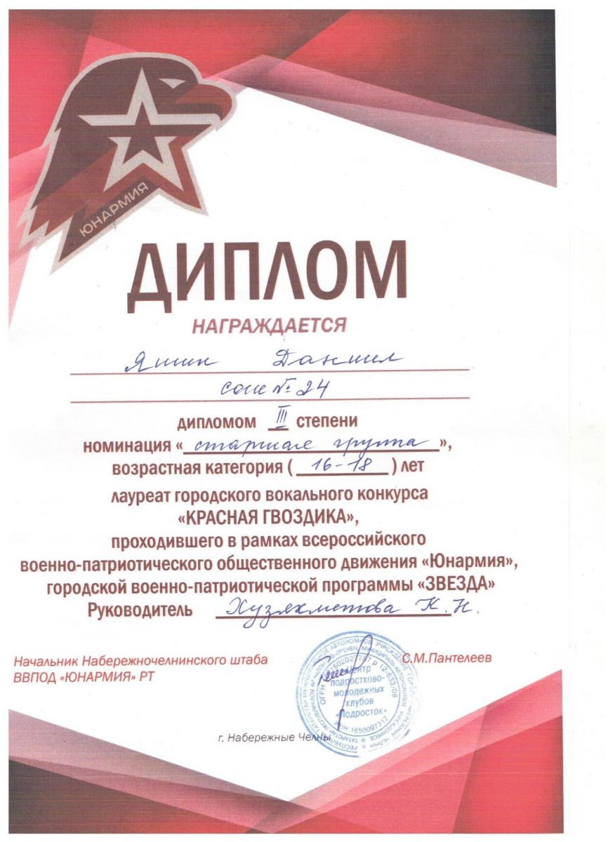 Опубликовано: 19.01.2018Поздравляем ученика 11 класса Яшина Даниила, лауреата городского конкурса «КРАСНАЯ ГВОЗДИКА», проходившего в рамках всероссийского военно-патриотического общественного движения «Юнармия», городской военно-патриотической программы «Звезда».