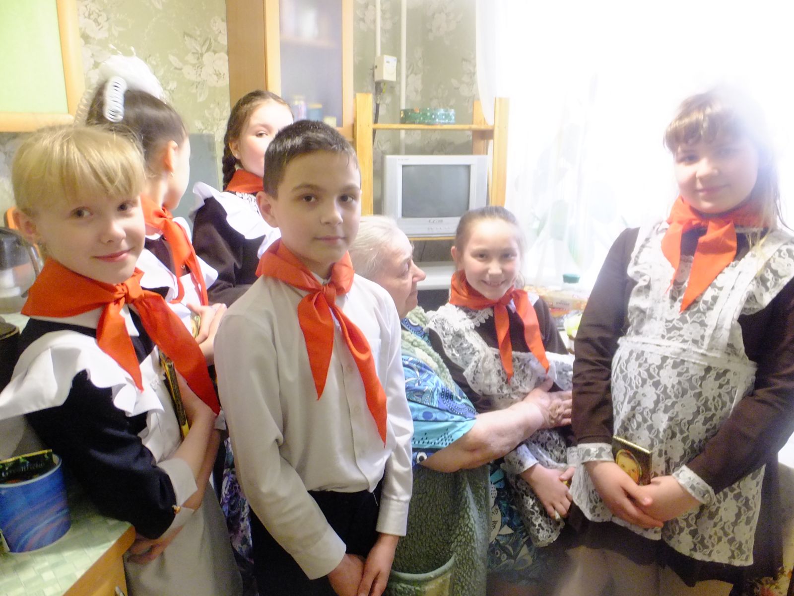 Ребята тимуровского отряда «Звездочки» посетили ветерана Великой Отечественной Войны. С радостью пообщались с пожилым человеком, читали стихи, спели военную песню, подарили подарки. Ветеран искренне была рада поговорить с ними, рассказала, как было нелегко в те страшные военные годы.