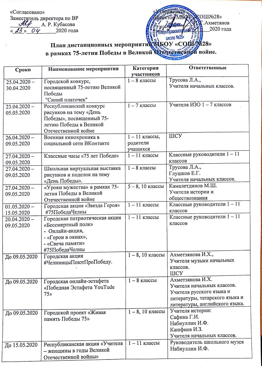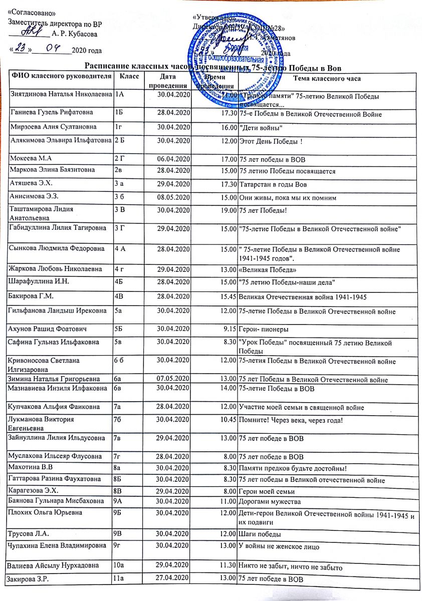 Расписание классных часов, посвященных 75-летию Победы в Великой Отечественной войне