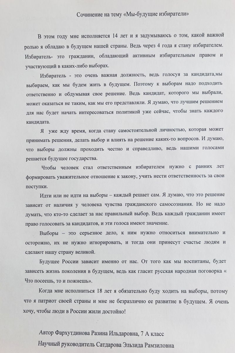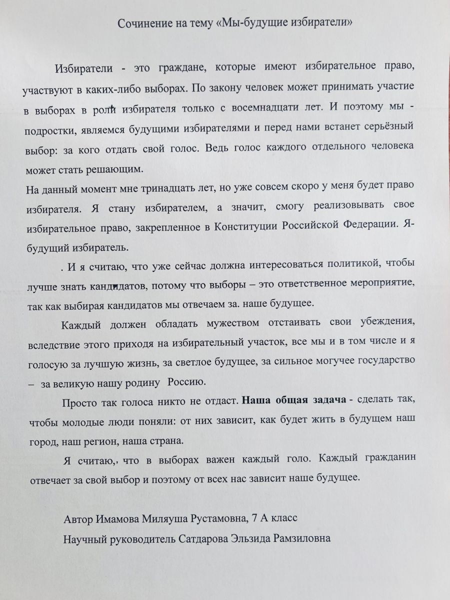 В рамках Парламентского урока – 2024 «Выбираем будущее!» в школе прошел конкурс сочинений среди учащихся 7 классов по теме "Мы — будущие избиратели".
