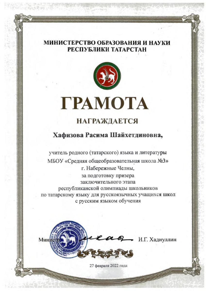 Выражаем благодарность Хафизовой Расиме Шайхетдиновне за подготовку