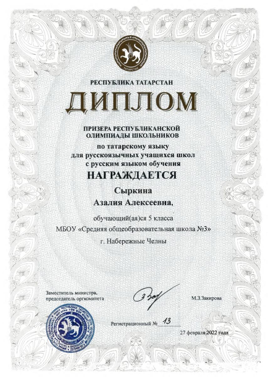 Ученица 5 «в» класса Сыркина Азалия стала призёром заключительного этапа Республиканской олимпиады по татарскому языку. Желаем ей здоровья, успехов в учёбе и новых побед!