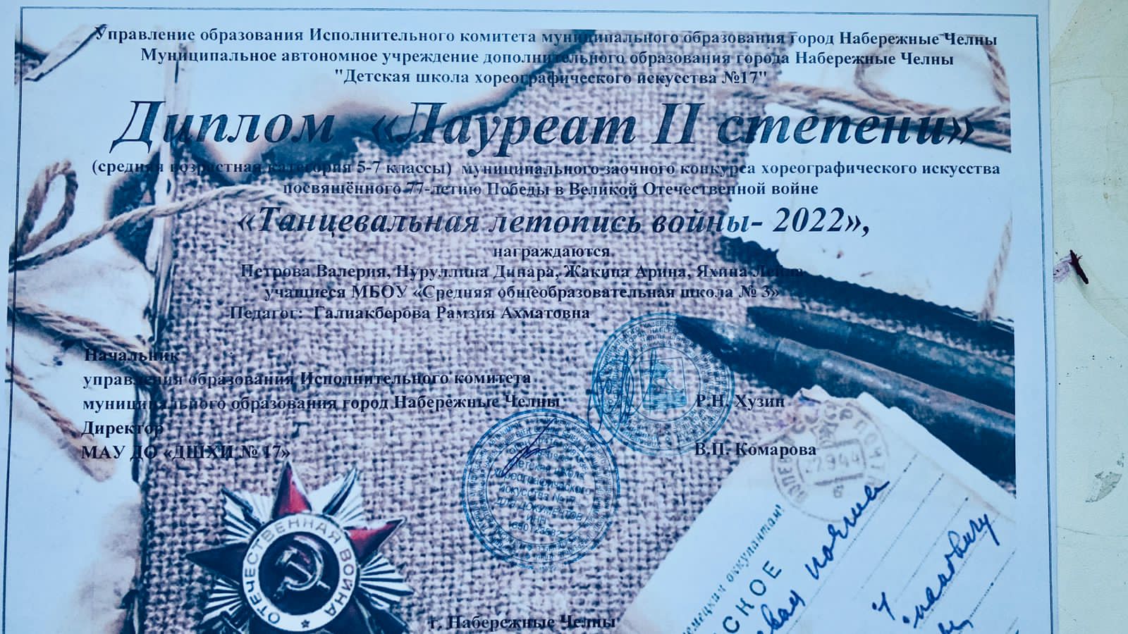 В рамках военно-патриотического месячника ученицы 6б класса Петрова Валерия Жакина Арина, Яхина Лейла, Нуруллина Динара стали Лауреатами II степени в городском конкурсе «Танцевальная летопись войны». Поздравляем наших учениц и желаем дальнейших успехов