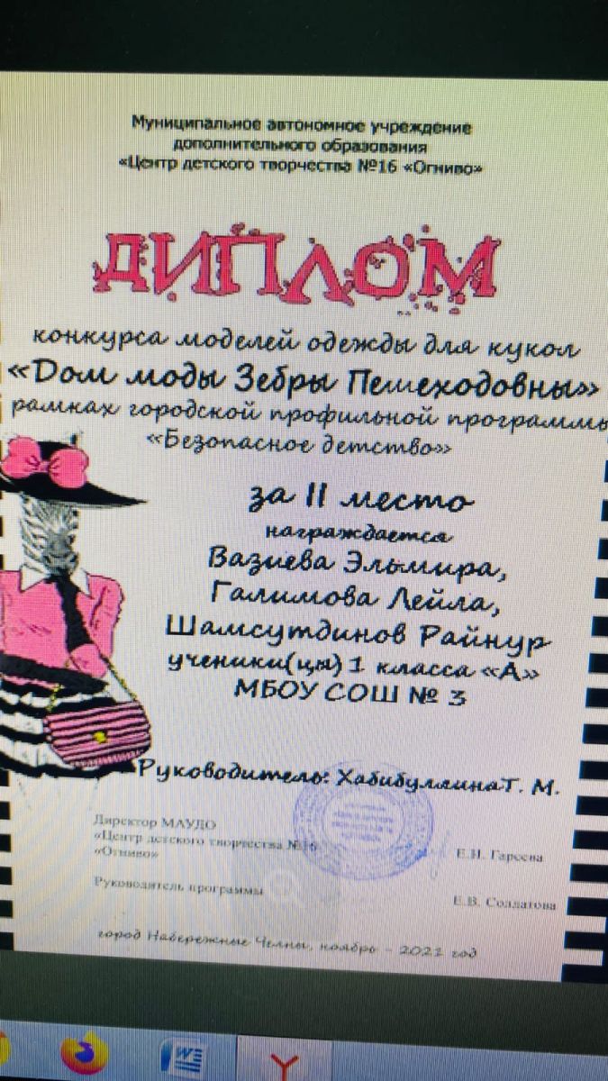 Поздравляем учащихся 1 "А" класса Вазиеву Эльмиру, Галимову Лейлу, Шамсутдинова Райнура (кл.руководитель Хабибуллина Т.М.), занявших 2 место в конкурсе моделей одежды для кукол "Дом моды Зебры Пешеходовны", в рамках городской профильной прогаммы "Безопасно детство"