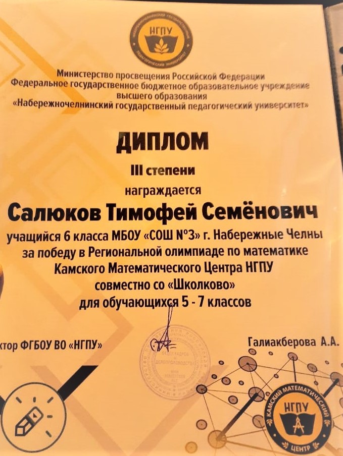 Поздравляем ученика 6А класса Салюкова Тимофея, занявшего 3 место в Региональной олимпиаде по математике Камского математического центра НГПУ совместно со "Школково" для обучающихся 5-7 классов