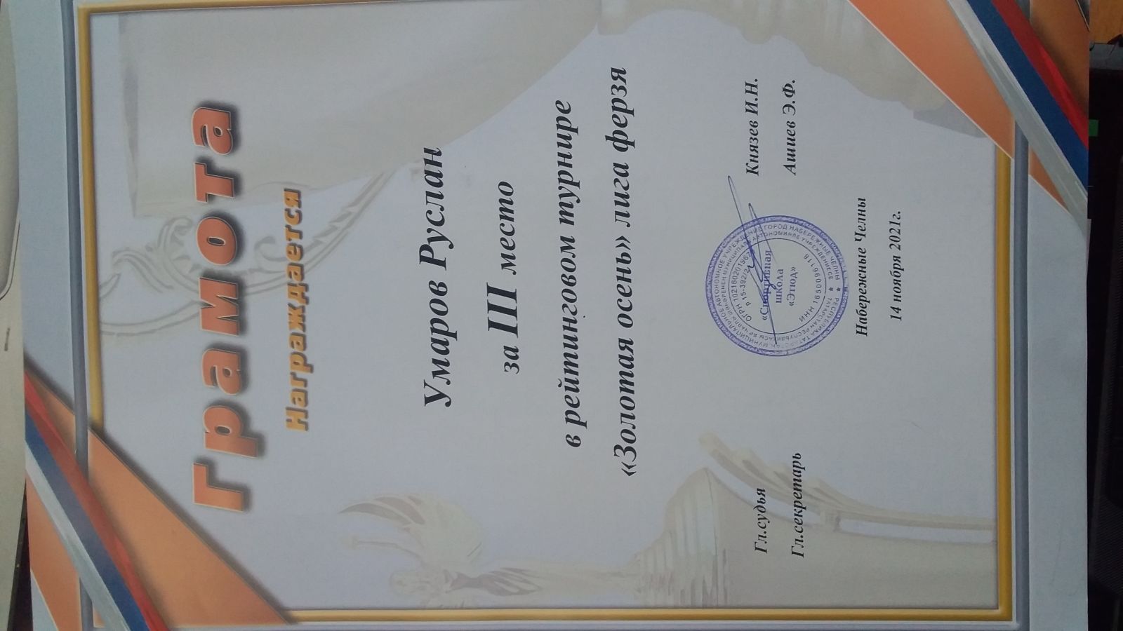 Поздравляем ученика 6В класса Умарова Руслана, занявшего 3 место в рейтиноговом турнире по шахматам "Золотая осень" лига фрезя