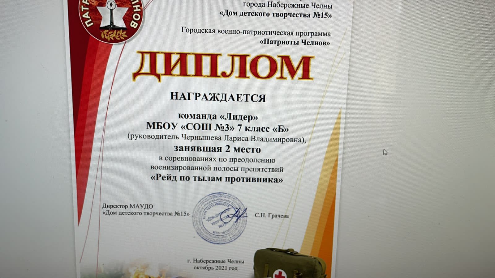 команду "Лидер" 7"Б" класса (руководитель Чернышева Л.В.), занявшую 2 место в соревнованиях по преодолению военизированной полосы препятствий "Рейд по тылам противника" в рамках городской военно-патриотической программы "Патриоты Челнов"