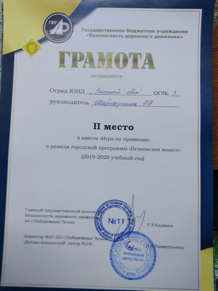 Поздравляем отряд ЮИД "Зеленый свет" (руководитель Шарифуллина Р.Р.), занявшего 2 место в квесте "Игра по правилам" в рамках городской программы "Безопасное колесо"