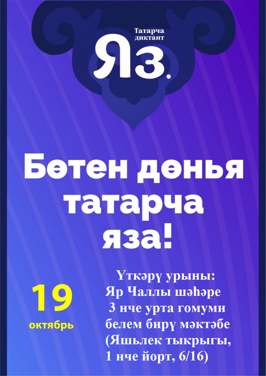 19 нчы октябрь көнне Яр Чаллы шәһәренең 3 нче урта мәктәбендә Бөтендөнья “Татарча диктант” акциясе үтте. Диктант тексты халык шагыйре, популяр җырлар авторы Роберт Миңнуллинның “Мин кулыма китап алам” мәкаләсеннән алынган. Акциядә 3 нче мәктәп җитәкчеләре, укытучылары, укучылары белән беррәттән әти- әниләр 5 нче мәктәп укучылары , 11 нче санлы балалар бакчасы хезмәткәрләре дә актив катнашты. Башка милләт вәкилләре дә диктант язуда теләп катнаштылар. Диктантны барлыгы 247 кеше язды. Акциядә төрле яшьтәге кешеләр катнашты. Иң өлкән диктант язучыга- 58 яшь, иң кечесенә-11 яшь. Чараның чакырылган кунагы- җырчы Алинә Гарифуллина. Ул да аудиторияләрнең берсендә диктант укыды. Акция уңышлы, оешкан төстә үтте.