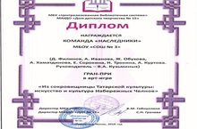 С 25.01.19 г. по 25.02. 19 г. команда школы «Наследники» участвовала в городском PR- проекте « Из сокровищницы Татарской культуры". Учащиеся 8А класса Филинов Дима, Обухова Жанна, Хаматдинова Алина, 10А кл.- Сорокина Екатерина и 5Б кл.-Трокина Николь и Куртова Аделина посещали необходимые объекты, фотографировались и отправляли задания. Было пройдено 5 этапов игры: «Библиотека», «Памятники и скульптуры города», «Посетить учреждение культуры и рассказать о нём», «Театральная жизнь города», «Музыкальная и хореографическая культура города». Ребята к игре отнеслись творчески, по всем заданиям были сделаны презентации и сняли экскурсионный ролик о библиотеке №10.