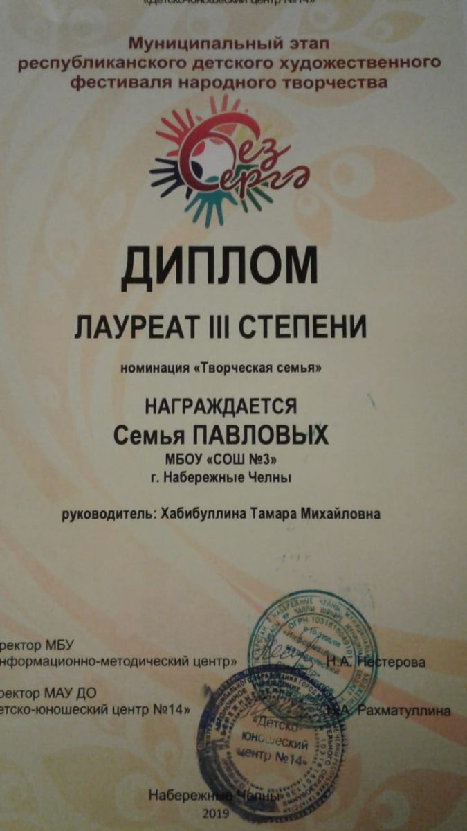 Поздравляем семью Павловых за 3 место в муниципальном этапе республиканского детского художественного фестиваля народного творчества "Без бергэ"