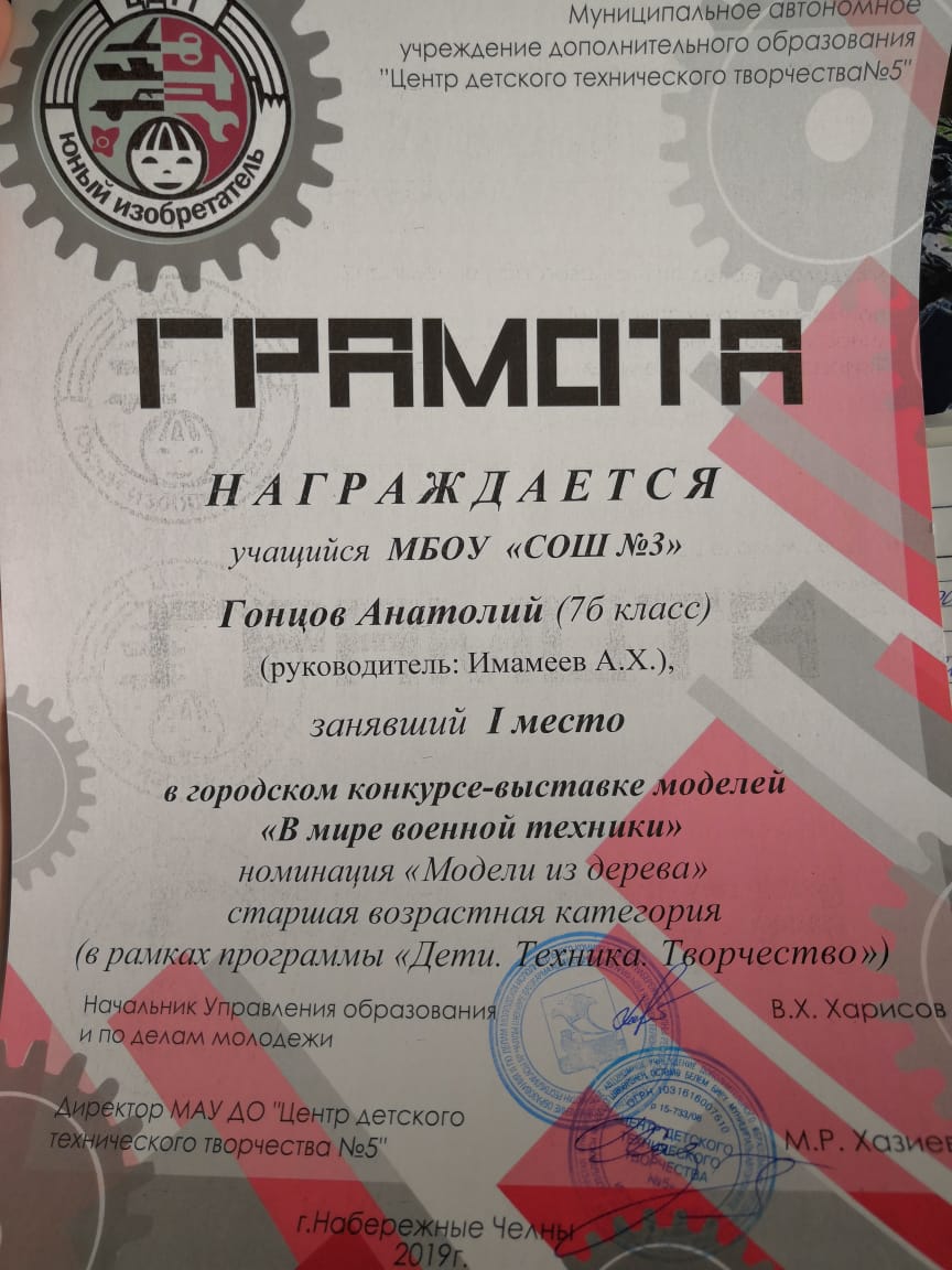 Поздравляем победителя городского конкурса-выставки моделей "В мире военной техники", номинация "Модели из дерева", ученика 7б класса Гонцова Анатолия (руководитель Имамеев А.Х.)