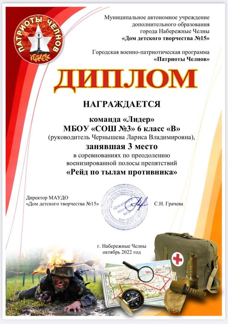 команду "Лидер" 6В класса (руководитель Чернышева Л.В.), занявшую 3 место в городских соревнованиях по преодолению военизированной полосы препятствий "Рейд по тылам противника"