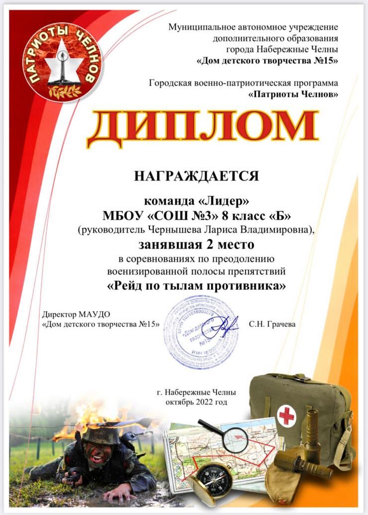 команду "Лидер" 8Б класса (руководитель Чернышева Л.В.), занявшую 2 место в городских соревнованиях по преодолению военизированной полосы препятствий "Рейд по тылам противника"