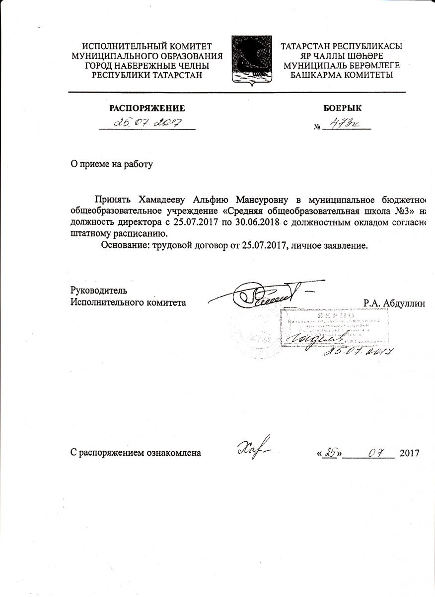 5. Распоряжение о приеме на работу на должность директора МБОУ "СОШ №3" Хамадееву А.М.