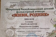 Ученица 2а класса М* Альфия одержала победу в Открытом Республиканском детском фольклорном конкурсе "Живи родник" в номинации "Художественное слово" младшая группа 1-4 классы.
