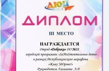 Команда "Добрики" школы №31 заняла 3 место по итогам 2021/2022 учебного года в городской программе "SaMoSтоятельные дети", организованной в рамках республиканского марафона "Живу ЗдОрово!". Руководитель команды Галимова Л.Р.