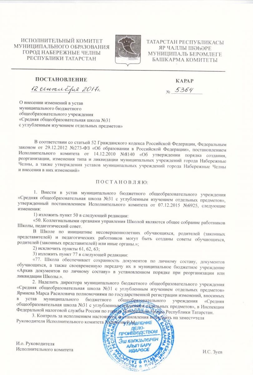 Постановление о внесении изменений в устав МБОУ СОШ №31 (от 12 сентября 2017 года №5364)