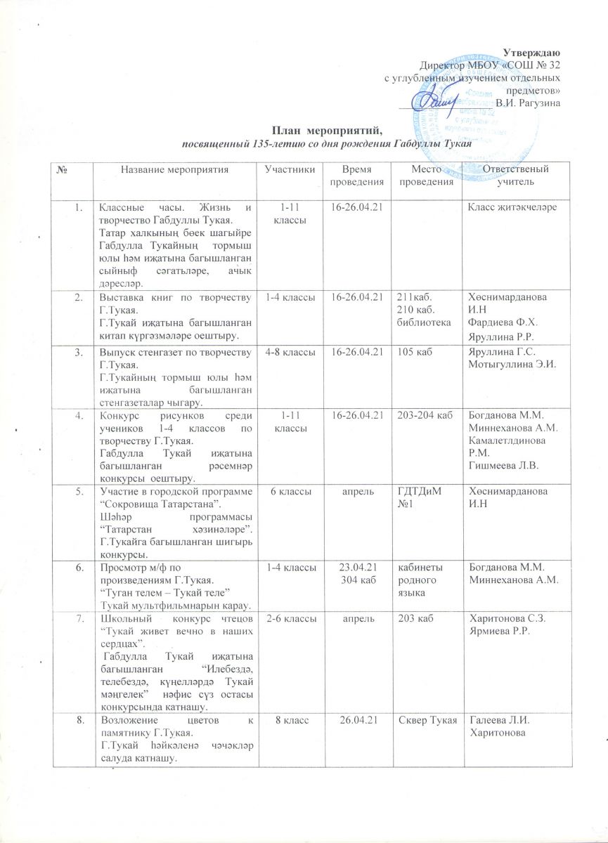 План мероприятий, порсвященный 135-летию со Дня рождения Г.Тукая