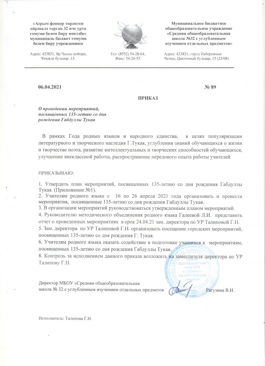 Приказ №89 от 06.04.2021 "О проведении мероприятий, посвященных 135-летию со Дня рождения Г.Тукая"