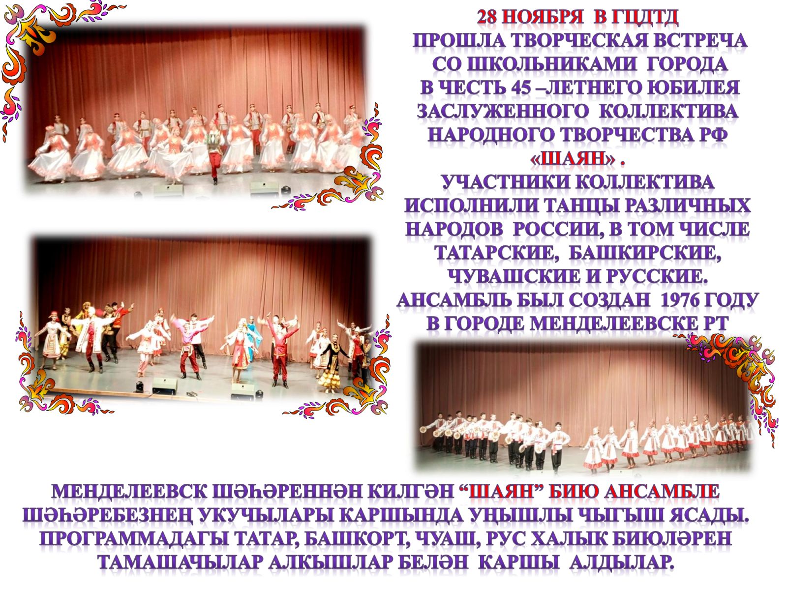 Серле дөнья! 22нче ноябрь көнне 15нче балалар иҗат йортында “Мин татарча сөйләшәм” дип аталган шәһәр программасының 2 этабы узды. Ул “Серле дөнья!дип аталды. Ул татар халкының мәдәниятенә, сәнгатенә: татар театрлары, күренекле артистлар тормышына багышланган квиз уен формасында уздырылды. 7А сыйныф укучылары өченче дәрәҗә дипломга лаек булдылар. Афәрин! Котлыйбыз!