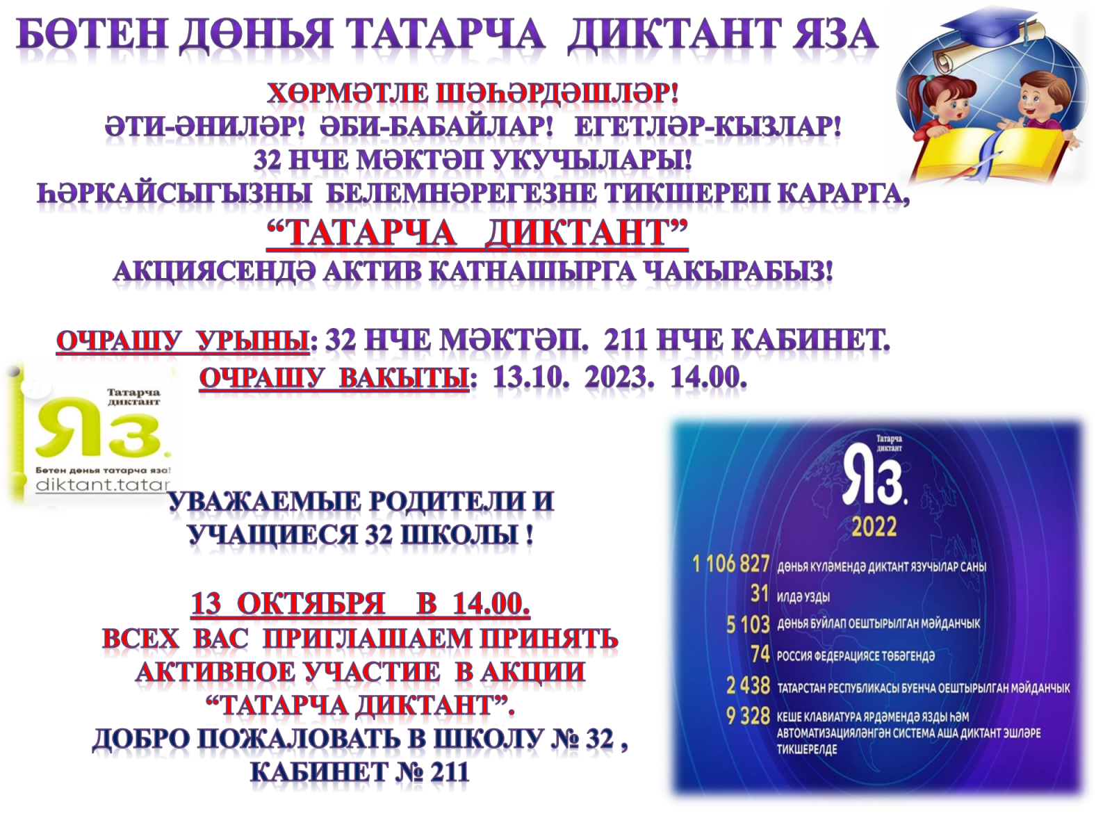 2023 елның 3 ноябреннән 8 ноябренә кадәр ел саен үткәрелә торган «Зур этнографик диктант» халыкара мәгърифәтчелек акциясе уза. «Зур этнографик диктант» ның максаты - кешеләрнең игътибарын илдә яшәүче халыкларның тарихына, мәдәниятенә һәм традицияләренә җәлеп итү. Безнең мәктәп укытучылары һәм укучылары акциядә катнаштылар. Акциядә катнашучылар 30 сорауга җавап бирделәр һәм яхшы белем күрсәттеләр. Диктант һәр катнашучыга үзенең этнографик грамоталылыгына инанырга һәм Россиядә яшәүче халыкларның гореф-гадәтләрен, рухи мәдәниятен белүләрен тикшерергә мөмкинлек бирә.