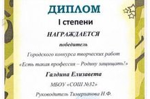 Поздравляем Галдину Елизавету, учителя Тимерханову Н.Ф. с победой в городском конкурсе творческих работ "Есть такая профессия - Родину защищать!" Желаем Вам новых побед!