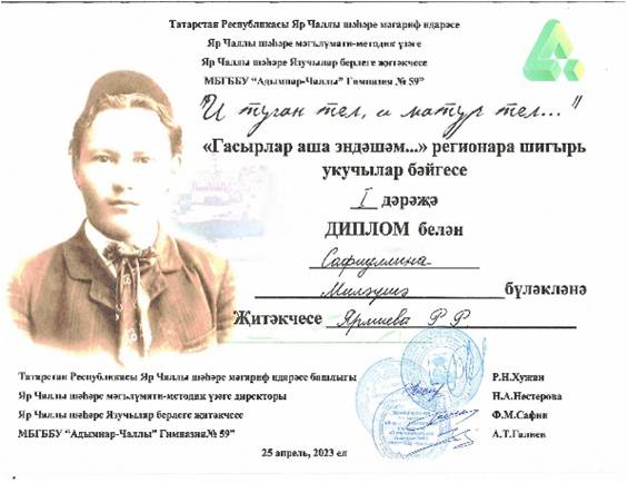25 апреля 2023г. в гимназии №59 «Адымнар» наградили победителей регионального конкурса чтецов на татарском языке «Обращаюсь через века». Ученицы нашей школы Миляуша Сафиуллина и Исмагилова Диляра были награждены дипломами за почётное 1 и 2 место. Поздравляем!!! Руководитель: Ярмиева Розалия Рефовна.