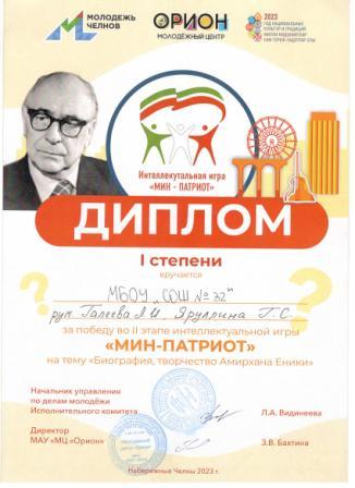 21 марта 2023 года в МЦ «Орион» прошла интеллектуальная игра «Я -патриот». Учащиеся 9В класса (Адамова А., Виноградов Э.,Гусманова А.,Стрелков П., Гордеев М., Камалова С.) активные участники и неоднократные победители данной программы. 2этап игры был посящен творчеству Амирхана Еники . Команда показала хорошие знания и была награждена Дипломом I cтепени. Молодцы!