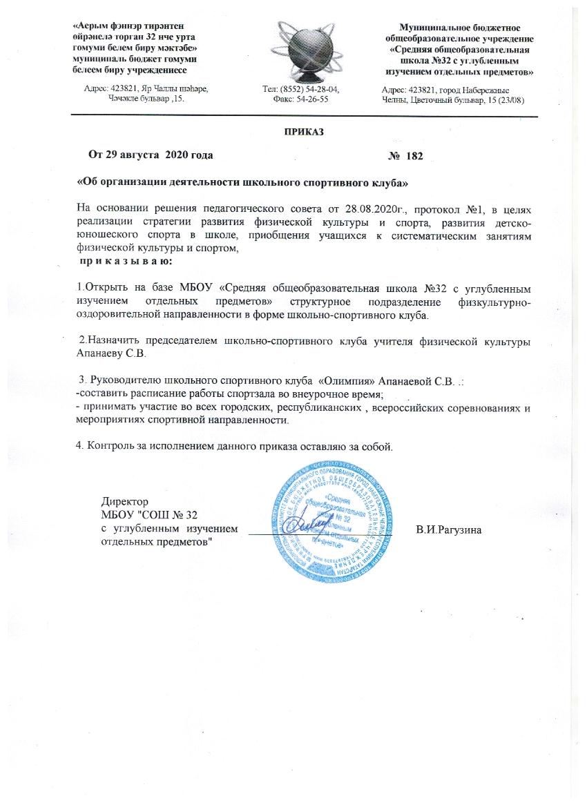 Приказ №182 от 29.08.2020 "Об организации деятельности школьного спортивного клуба"