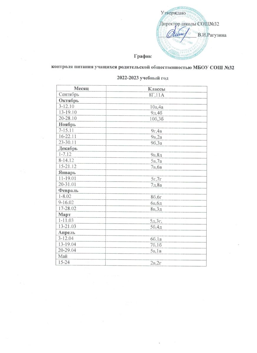 График контроля питания родительской общественностью МБОУ "СОШ №32" 2022-2023 учебный год