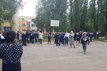 В школе прошла учебная пожарная эвакуация, где ребята быстро и слаженно покинули здание, собравшись на спортивной площадке.