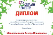 С 15 марта по 10 мая по всей России проходили уроки экологического просвещения. Акция «Всероссийский экологический урок «Сделаем вместе!», рассчитанная на учащихся средней и старшей школы, объединила взрослых и детей в одной общей идее — обратиться к решению экологических проблем и своим личным примером и участием изменить ситуацию в лучшую сторону. Ученица нашей школы Мардегалямова Резеда являясь эколидером школы приняла самое активное участие и стала победителем в региональном этапе в номинации "Эколидер". Редеда желаем удачи в дальнейшей экологической деятельности!