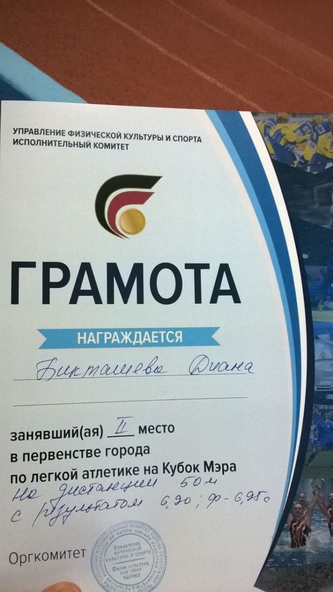 Спортивная команда нашей школы под руководством учителей физической культуры Арсионовой Н.Г. и Муртазиной И.А. принимала участие в первенстве города по легкой атлетике на Кубок Мэра. Ученица 8б класса Бикташева Диана заняла почетное второе место! Поздравляем! Молодец!