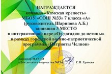 11 мая команда учащихся 7а класса приняла участие в финальной игре в этом учебном году городской программы "Патриоты Челнов". Ребята заняли 3 место. Желаем творческих успехов, новых побед и активности!