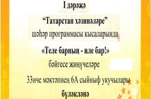 «Татарстан хәзинәләре » шәһәр программасы кысаларында “Теле барның – иле бар!” бәйгесендә катнашкан 6нчы А сыйныфы укучыларын һәм аларның җитәкчесе, туган тел һәм әдәбияты укытучысы Халилова Айгөл Лотфулловнаны чын күңелдән җиңүләре белән котлыйбыз!!!