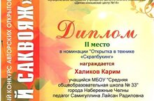 Поздравляем ученика 3 А класса Халикова Карима со 2 местом в региональном конкурсе авторских открыток "Пёстрый саквояж" в номинации " Открытка в технике "Скрапбукинг".