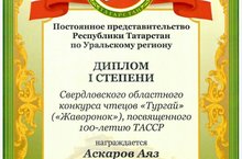 Поздравляем ученика 5А класса Аскарова Аяза и его руководителя Сибгатуллина Ф.Н, с победой в конкурсе чтецов "Тургай", посвященного 100-летию ТАССР.