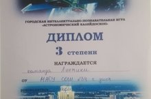 Учащиеся 7б класса приняли участие в городской интеллектульно- познавательной игре "Астрономический калейдоскоп". Где команда "Лунтики" заняли 3 место. Поздравляем! место