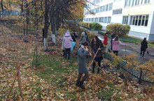Продолжается уборка листьев на территории школы. Учащиеся средних и старших классов переодически выходят на сбор мусора.