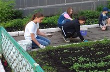Ребята во время каникул работают на пришкольном участке. Они с удовольствием пропалывают грядки и ухаживают за цветами.