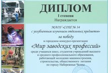 На конкурсе «Мир заводских профессий» наша школа была награждена дипломом 1 степени среди учащихся школ, студентов, учреждений высшего и среднего профессионального образования , работающей молодёжи машиностроения, строительства, общественного питания по городу Набережные Челны. Поздравляем нашу команду с достойной наградой! 29.04.2015