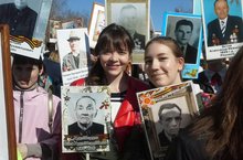 Дети, родители, учителя, все пришли с портретами родных, погибших в дни Великой Отечественной войны на парад "Бессмертный полк ".