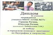 Язучы Айдар Хәлимнең тормыш юлы һәм иҗатына багышланган шәһәр-викторинасында 4нче "а" сыйныфы укучылары Гараева Регина, Юнусова Регина 2 нче дәрәҗә дипломга лаек булдылар. Укучыларга һәм укытучылары Хабибуллина Э.М.га рәхмәт белдерәбез, уңышлар телибез.