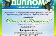 Ученица 8а класса Закирова Алия приняла участие в конкурсе "Цвети, мой Татарстан" в рамках фестиваля-конкурса детского народного творчества "Таланты Татарстана" и была награждена почетным дипломом.