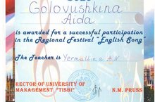 Поздравляем учащуюся 11 а класса Головушкину Аиду, занявшую 2-е место в региональном фестивале английской песни в номинации "Вокал.Соло", организованном Набережночелнинским филиалом Университета Управления "ТИСБИ". (Учитель: Ермуллина А.Н.) Желаем успехов в изучении английского языка и творческих достижений!