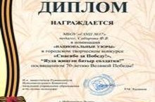 "Спасибо за Победу!", "Яуда җиңгән батыр солдатка!" Бөек Җиңүнең 70 еллыгына багышланган шәһәр конкурсына нәтиҗәләр ясалды. 6 нчы "а" сыйныфы укучысы Сабиров Айнур (җитәкчесе Сабирова Ф.В.) "Дымковская игрушка" номининациясендә җиңеп, диплом белән бүләкләнде.