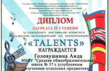 Поздравляем ученицу 11а класса Головушкину Аиду, занявшую 2-е место в VI открытом фестивале-конкурсе вокалистов-исполнителей на иностранном языке "Talents" в номинации "Вокал-соло" (учитель: Ермуллина А.Н.) Желаем успехов как в изучении английского языка,так и в творческой деятельности.