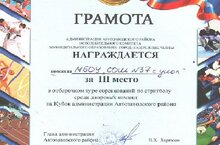 Награждается команда МБОУ "СОШ №37 с уиоп" за III место в отборочном туре по стритболу среди дворовых команд на Кубок администрации Автозаводского района.
