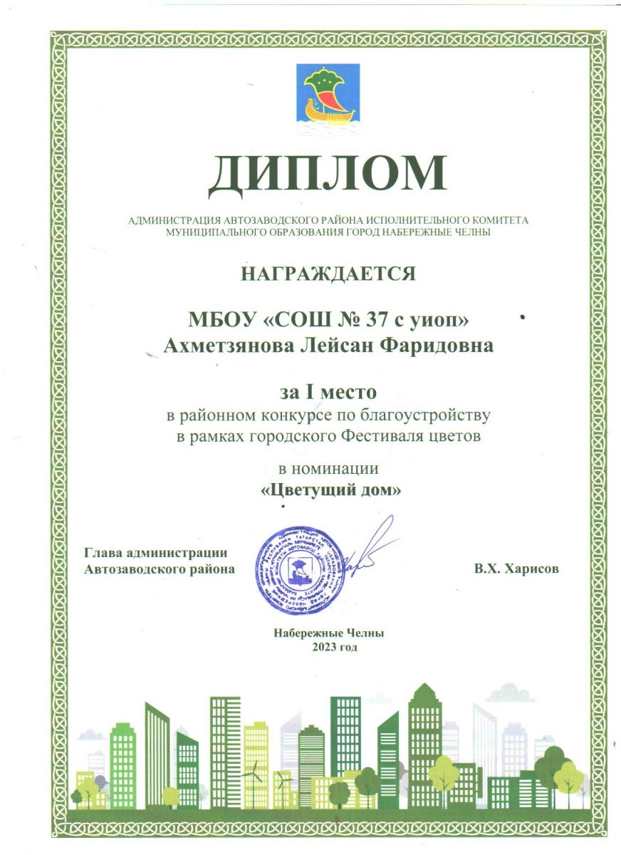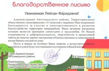 Администрация Автозаводского района, Территориальное общественное самоуправление "51 комплекс" выражает искреннюю благодарность за участие и заинтересованность в развитии благоустройства микрорайона директору "СОШ 37 с уиоп" Лейсан Фаридовне Ахметзяновой. В благодарственном письме отмечена активная жизненная позиция директора школы, её самоотдача и трудолюбие.